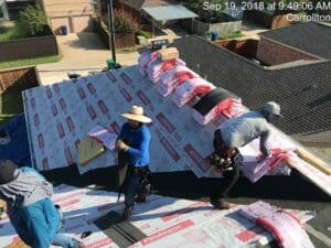 It’s 9:08am, we started at 7am, and the entire old roof has already been removed, roof prepped and cleaned, new synthetic felt installed, new leak barrier installed and we are loading the roof with the new bundles of shingles. This is the proper time frame for a true roofing specialist crew.